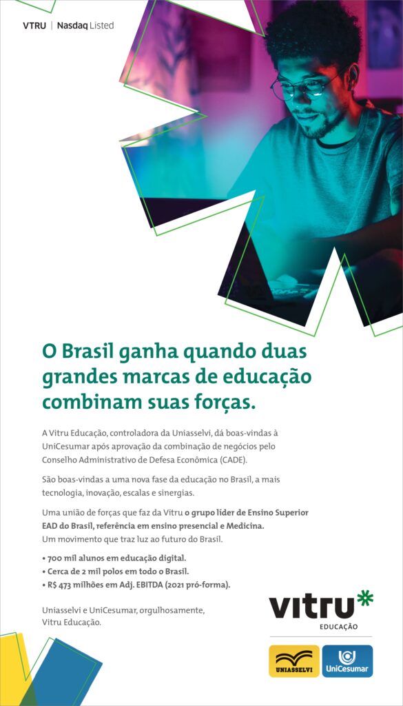 provada sem restrições pelo Conselho Administrativo de Defesa Econômica (Cade), a combinação dos negócios entre a Vitru Educação, controladora da marca Uniasselvi, com a UniCesumar é o destaque da nova campanha publicitária da holding. Com assinatura da agência Seven Comunicação Total, o projeto tem como mote “Quando o futuro é incerto, a educação ilumina” e evidencia nas peças a democratização da educação, característica do ensino a distância.