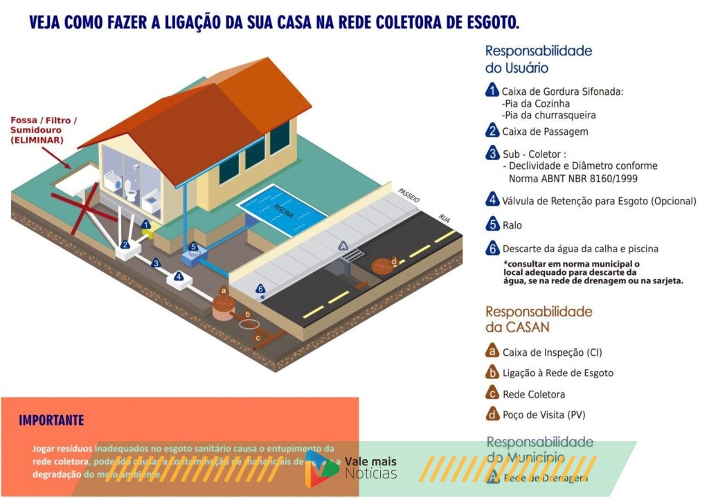 A CASAN reforça a importância de que a comunidade do bairro Tapajós faça a ligação do esgoto de residência à rede pública coletora. A orientação da Companhia é de que os proprietários busquem o auxílio de um encanador, pedreiro ou de um instalador hidráulico para verificar as instalações internas de esgoto. O próximo passo é fazer a conexão com a Caixa de Inspeção (CI) instalada em frente aos imóveis. Toda as adaptações são de responsabilidade do morador.