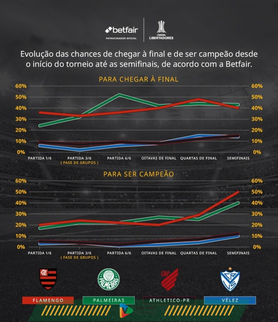 A Betfair, especialista em cálculo de probabilidades, analisou a trajetória de Flamengo, Palmeiras, Athletico Paranaense e Vélez Sarsfield durante toda a Libertadores desde a fase de grupos.