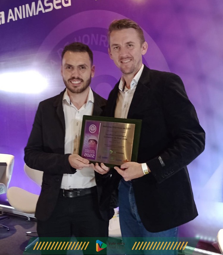 O Técnico em Segurança do Trabalho e Meio Ambiente da Incofios, Lucas Voltolini e o Coordenador de Saúde, Segurança e Meio Ambiente do Grupo Rovitex, André Ruediger, durante a premiação.