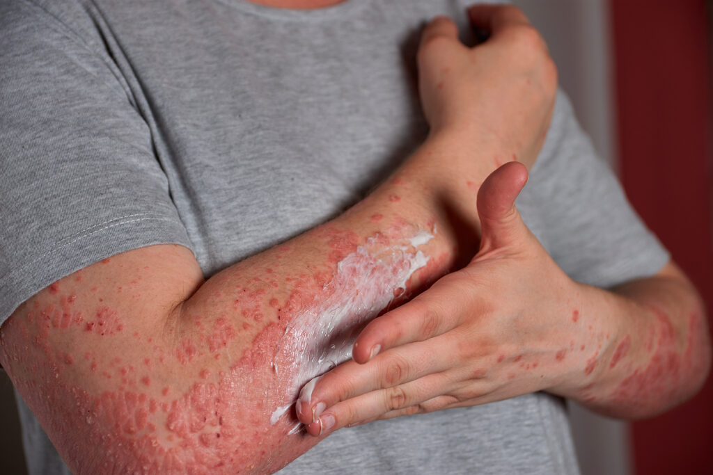 Bethania explica também que a inflamação causada pela psoríase pode se apresentar nos vasos sanguíneos. O problema junto à síndrome metabólica facilita o entupimento de artérias por placas de gordura e, por consequência, casos de infarto e AVC. “O estilo de vida também impacta a saúde dos pacientes. Muitos deixam a atividade física de lado por questões estéticas relacionadas às lesões da psoríase. Elas podem gerar constrangimento em situações em que são expostas devido à vermelhidão e às suas escamações”, acrescenta.