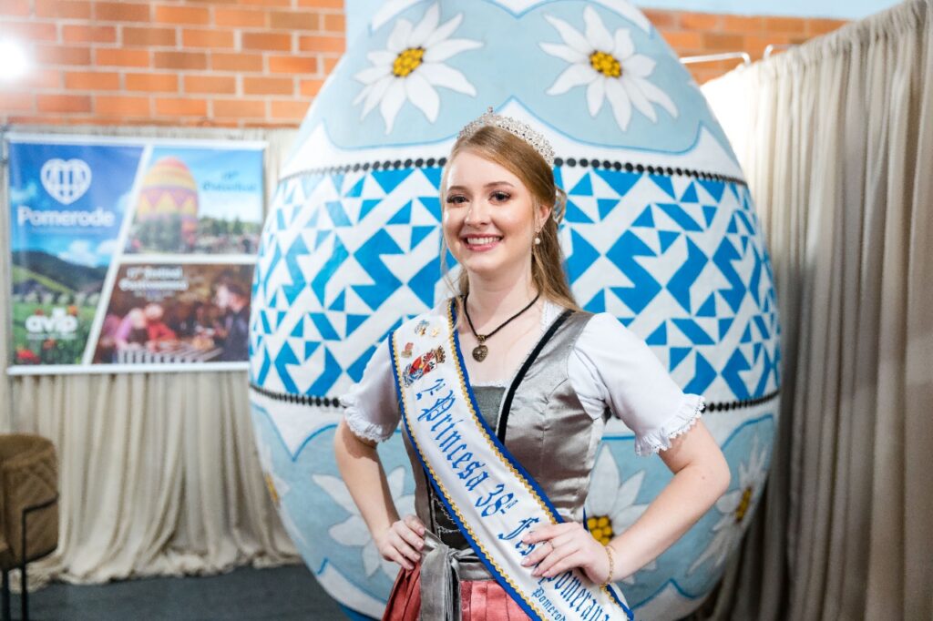 O ano de 2023 promete ser intenso para o turismo em Pomerode (SC). A 38ª Festa Pomerana acontece até 22 de janeiro na cidade mais alemã do Brasil. E o evento se conecta a outra agenda tradicional da cidade, a 15ª Osterfest, de forma curiosa. Um dos ovos da Eier Parade, roteiro de ovos com 2,5 metros de altura que faz parte da programação, foi pintado pela segunda princesa da Festa, Nicole Schroeder.
