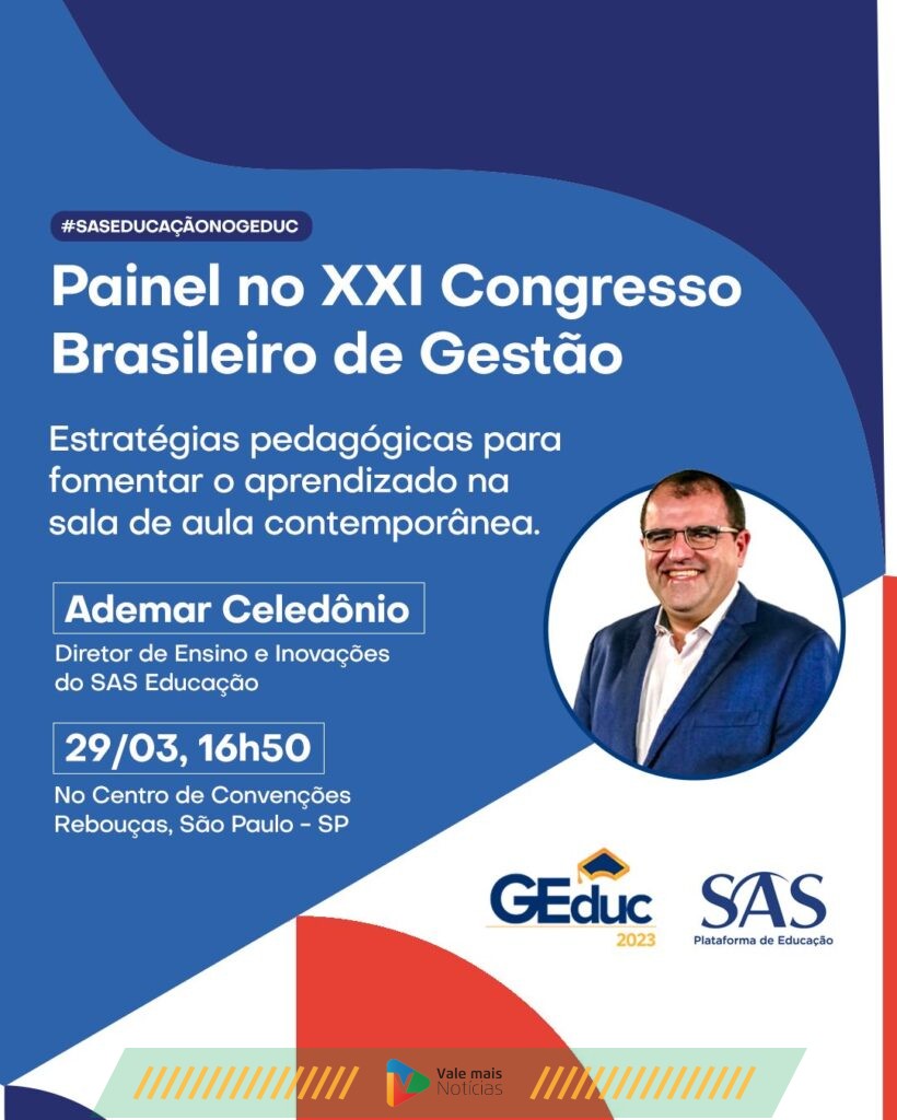 São Paulo, março de 2023 – Nos próximos dias 29, 30 e 31 de março, acontece em São Paulo, no Centro de Convenções Rebouças, o GEduc, principal Congresso de Gestão Educacional do país. O SAS Plataforma de Educação estará presente na edição deste ano, que leva como tema os “Novos Caminhos para a Educação”, com um estande exclusivo e palestra do Diretor de Ensino e Inovações Educacionais, Ademar Celedônio. Ele debaterá sobre “Estratégias pedagógicas para fomentar o aprendizado na sala de aula contemporânea” durante a programação específica para a educação básica e técnica, no dia 29, às 16h50.