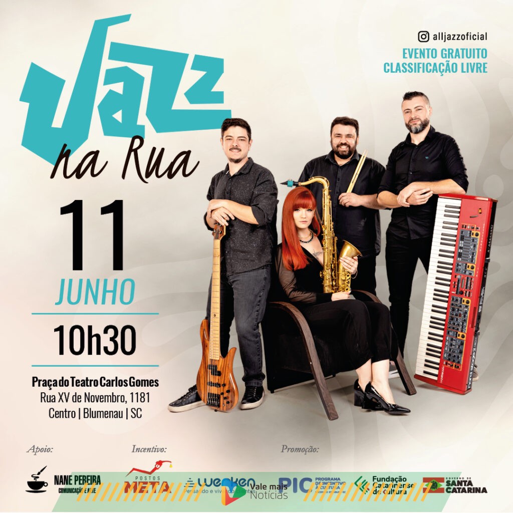 Jazz para todos os ouvidos. De junho a dezembro deste ano, o projeto Jazz na Rua levará oito apresentações de música instrumental gratuitas a espaços públicos da rua XV de Novembro, no Centro de Blumenau. Os concertos são com o grupo AllJazz, formado pelos artistas Caio Fernando, no baixo elétrico e acústico; JP, na bateria; Rafa Girardi, nos teclados; e Suelen Mondini, no saxofone. O primeiro evento acontece no dia 11 de junho, às 10h30, na praça do Teatro Carlos Gomes. As ações ocorrem uma vez por mês, aos domingos, são gratuitas, abertas ao público e comunidade em geral. Classificação indicativa Livre.