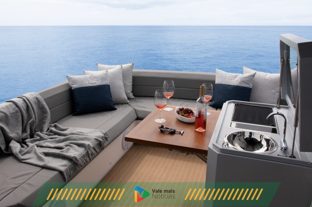Além dos decks laterais, como sacadas sobre as águas, o barco também se destaca pela plataforma deslizante na popa e que amplia ainda mais a área para esportes náuticos e lazer. A praça de popa vem equipada com espaço gourmet e amplo sofá que se conectam à cozinha do cockpit situada na parte de trás, ideal para confraternizações em família e amigos.