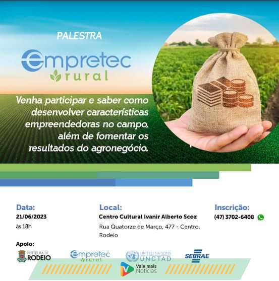 O Empretec, programa aplicado pelo Sebrae/SC e que foca no desenvolvimento das habilidades empreendedoras, tem também uma vertente voltada exclusivamente para o agronegócio: é o Empretec Rural. Para explicar mais sobre a proposta e atrair participantes para a capacitação, uma palestra gratuita será oferecida em Rodeio no dia 21 de junho, a partir das 18h, no Centro Cultural Ivanir Alberto Scoz. As inscrições são limitadas e podem ser feitas através do whatsapp (47) 3702-6408.