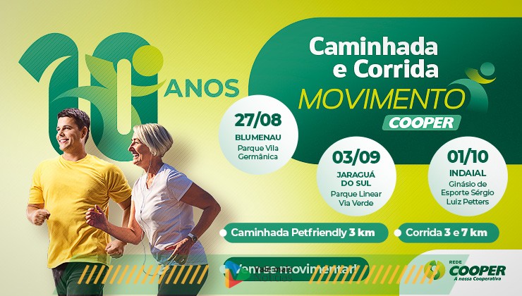 Estão abertas as inscrições para mais uma edição da Caminhada e Corrida Movimento Cooper, uma inciativa da Rede Cooper que visa promover a qualidade de vida e incentivar a prática de atividades físicas nas comunidades. As provas serão realizadas em Blumenau, Jaraguá do Sul e Indaial, com datas e locais específicos: Blumenau em 27 de agosto, com largada no Parque Vila Germânica; Jaraguá do Sul no dia 3 de setembro, em um novo local, no Parque Linear Via Verde; e Indaial em 1º de outubro, no Ginásio de Esportes Sergio Luiz Petters