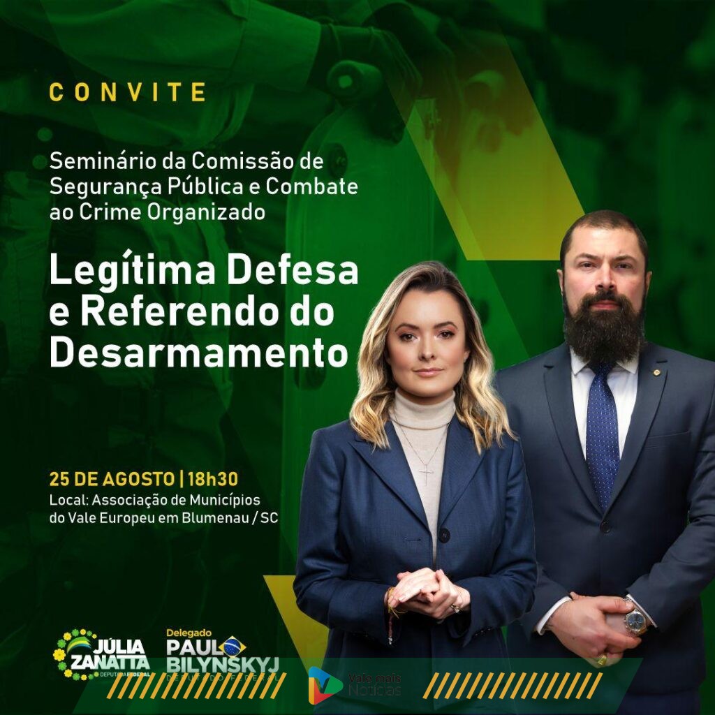 A Comissão de Segurança Pública e Combate ao Crime Organizado da Câmara de Deputados promove, na próxima sexta-feira, dia 25 de agosto, quando se comemora o dia do soldado, o Seminário Legítima Defesa e Referendo do Desarmamento, na Associação de Municípios do Vale Europeu, em Blumenau, das 19h às 21h. O evento tem por objetivo discutir os aspectos da defesa legítima e o referendo do desarmamento, trazendo diversas perspectivas, sob o ponto de vista de 10 palestrantes. Entre eles, o advogado blumenauense Rafael Fausel, o deputado federal, Eduardo Bolsonaro, e o Governador de Santa Catarina, Jorginho Melo.