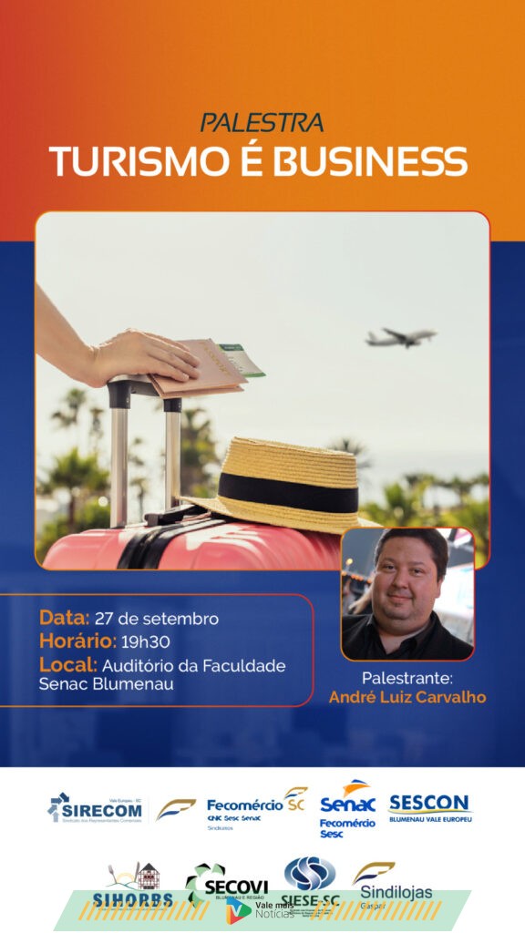 palestra “Turismo é Business”, que será ministrada por André Luiz Carvalho. O evento será na quarta-feira, 27 de setembro, às 19h30, no Auditório da Faculdade Senac, em Blumenau. A palestra abordará a importância do turismo como atividade econômica, destacando como essa prática pode trazer resultados imediatos para os negócios de uma região. Carvalho enfatiza a necessidade de um planejamento estratégico que envolva todos os participantes do setor, alinhando objetivos e ações para impulsionar o turismo de forma sustentável.