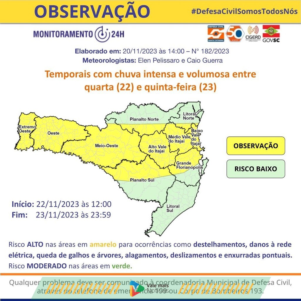 No período entre quarta (22) e quinta-feira (23), são esperados temporais com chuva intensa e volumosa em toda Santa Catarina, em especial nas regiões do Grande Oeste, Planaltos e Vale do Itajaí. Estas chuvas se devem ao processo de formação e avanço de uma frente fria, combinada ao ar quente e úmido vindo do norte do país. O risco é alto nas áreas em amarelo para ocorrências associadas aos temporais, como destelhamentos, danos à rede elétrica, queda de galhos e árvores, e à chuvas volumosas, como alagamentos, deslizamentos e enxurradas. O risco é moderado nas áreas em verde.