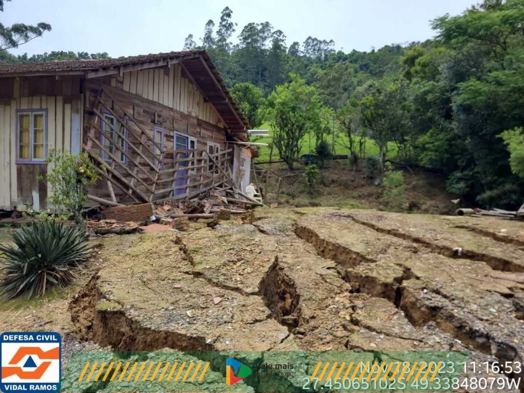 Um deslizamento de terra em Vidal Ramos, no Alto Vale do Itajaí, provocou a interdição de três casas. Imagens feitas pela prefeitura mostram rachaduras que surgiram nos imóveis e também nas ruas. O problema aconteceu na semana passada e está sendo monitorado pelo órgão.