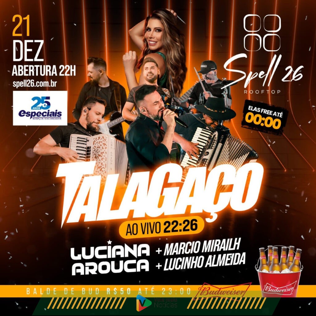 Em mais uma ação para promover o melhor da música brasileira, o Spell 26, considerado o maior rooftop em Shopping center do Brasil, traz a Blumenau o show nacional do Grupo Talagaço, donos dos hits “Vou Tomar Birita”, “Eu To Bebendo Todas” e “Amor de Rodeio”. O grupo comanda o palco do Spell na quinta-feira (21), a partir das 22 horas. A noite também ficará por conta dos Djs residentes Luciana Arouca e Márcio Mirailh , além da presença especial do Dj Lucinho Almeida.