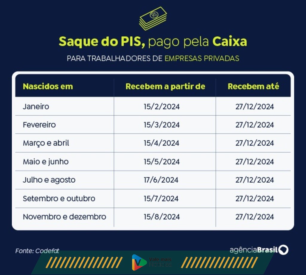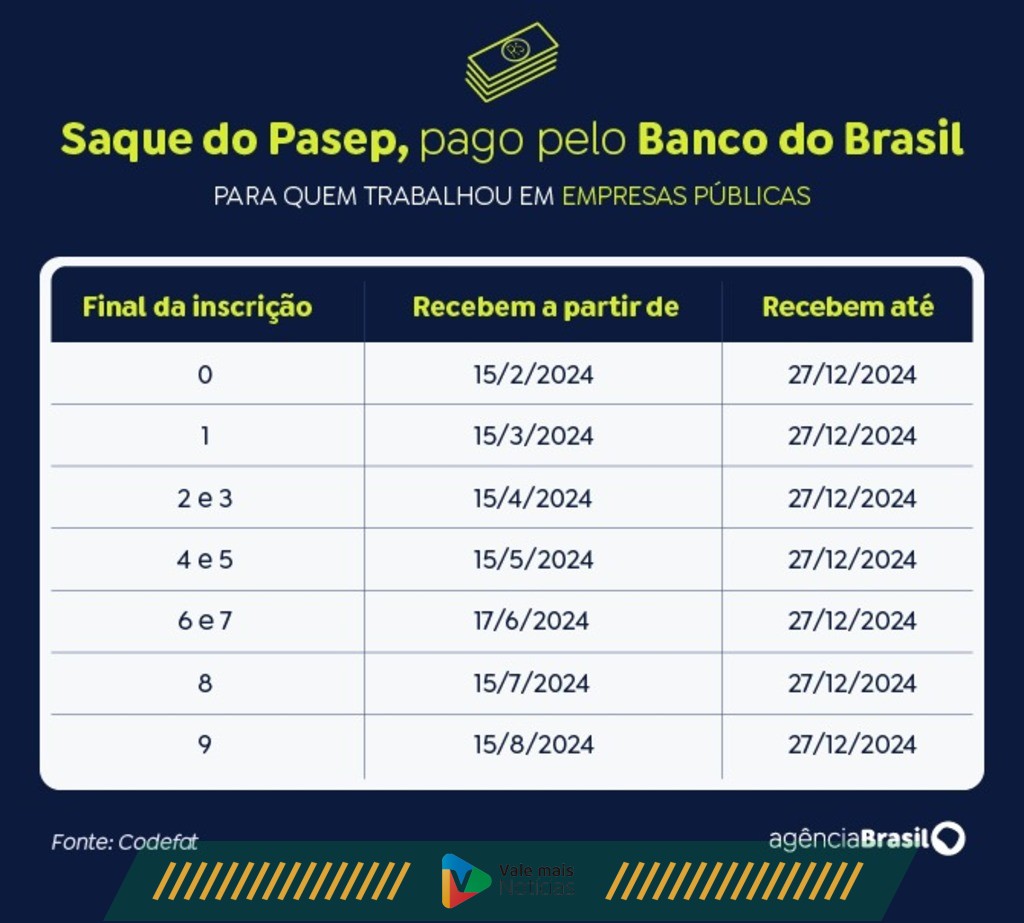 O PIS é pago pela Caixa Econômica Federal e o Pasep, pelo Banco do Brasil. Como ocorre tradicionalmente, os pagamentos serão divididos em seis lotes, baseados no mês de nascimento, no caso do PIS, e no número final de inscrição, no caso do Pasep. O saque iniciará nas datas de liberação dos lotes e acabarão em 27 de dezembro de 2024. Após esse prazo, será necessário aguardar a convocação especial do Ministério do Trabalho e Previdência.