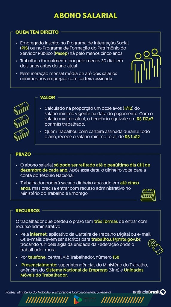 Tem direito ao benefício o trabalhador inscrito no PIS/Pasep há, pelo menos, 5 anos, e que tenha trabalhado formalmente por, no mínimo, 30 dias no ano-base considerado para a apuração, com remuneração mensal média de até dois salários mínimos. Também é necessário que os dados tenham sido informados corretamente pelo empregador na Relação Anual de Informações Sociais (Rais).