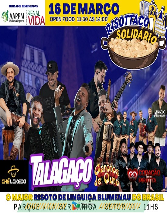 Serão 11 horas de festa solidária com a apresentação dos seguintes grupos: Angelo Frainer (sertanejo/pagonejo), e bandas Talagaço, Garotos de Ouro, Coração Pirata e Chê Lokedo. Das 11h30min às 14h o risoto será servido à vontade.