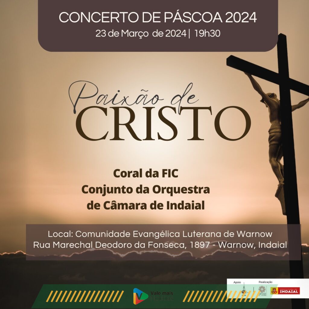 No dia 23 de março, às 19h30, a comunidade é convidada a prestigiar o Concerto da Paixão de Cristo na Comunidade Evangélica Luterana de Warnow – Igreja da Ascensão, localizada na Rua Marechal Deodoro da Fonseca, 1897, Warnow. O evento é realizado pela Fundação Indaialense de Cultura em parceria com a Comunidade Luterana.
