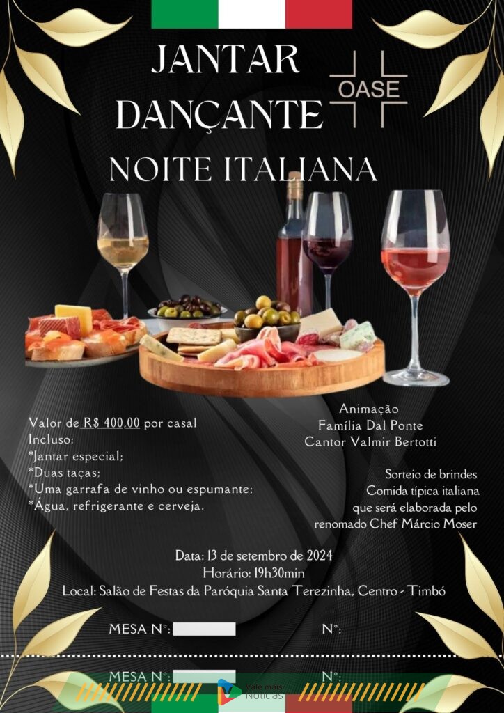 Este ano, o evento, intitulado “Noite Italiana,” ocorrerá no dia 13 de setembro, a partir das 19h30min, no Salão de Festas da Igreja Católica Santa Terezinha, no Centro de Timbó.