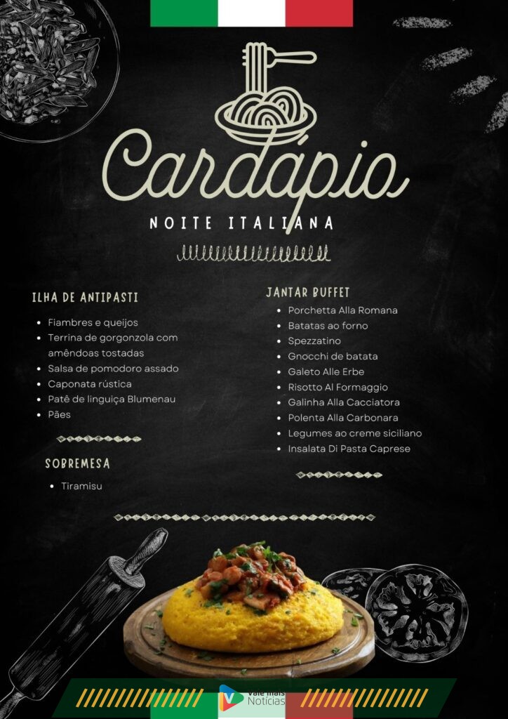 O cardápio da “Noite Italiana” será uma verdadeira celebração da culinária italiana, começando com uma entrada de frios variados, como queijos, caponatas, patês e torradas. O jantar incluirá pratos típicos como Porchetta Alla Romana, Batatas ao Forno, Spezzatino, Gnocchi de Batata, Galeto Alle Erbe, Risotto Al Formaggio, Galinha Alla Cacciatora, Polenta Alla Carbonara, Legumes ao Creme Siciliano e Insalata Di Pasta Caprese. A sobremesa será o clássico Tiramisu, conforme detalhou o chef Márcio Moser, responsável pela preparação dos pratos desta edição.