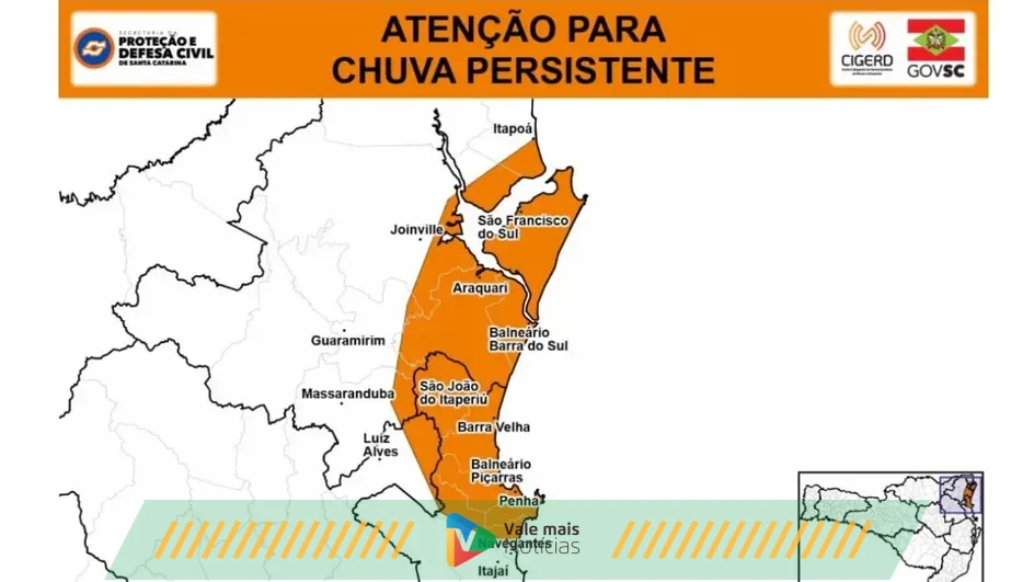 O alerta é válido por três horas e compreende as cidades de Joinville, Itapoá, São Francisco do Sul, Araquari, Balneário Barra do Sul, São João do Itaperiú, Guaramirim, Barra Velha, Balneário Piçarras, Penha, Navegantes e Itajaí.
