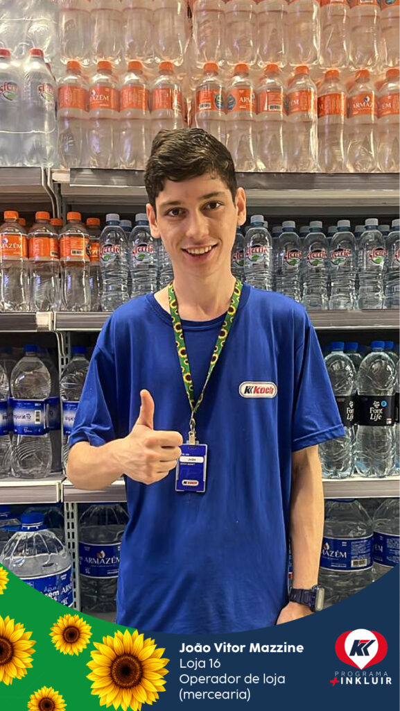 Graças às ações do programa +INKLUIR, o João Vitor Mazzine Oliveira, que é autista passou de empacotador para operador de loja, auxiliando nas operações gerais, desde atendimento aos clientes à reposição de mercadorias. Ele está há cinco anos na empresa. “O grupo Koch me acolheu muito bem e gosto muito de trabalhar aqui. Eu tive a oportunidade de subir de cargo. Todos os dias aprendo coisas novas”, conta.